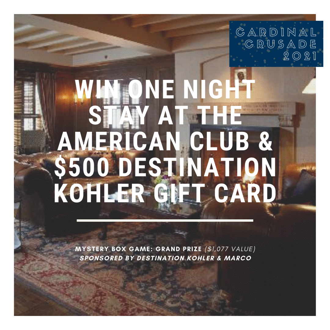 Mystery Box Game: We're taking our mystery box game virtually and everyone who plays wins! We're selling only 40 boxes at just $40 each (sure to go fast!). Boxes will be purchased online and available for pick up the week after the event. Will you be the lucky grand prize winner of the One Night Stay in Deluxe Guestroom at The American Club & $500 Destination Kohler Gift Card?